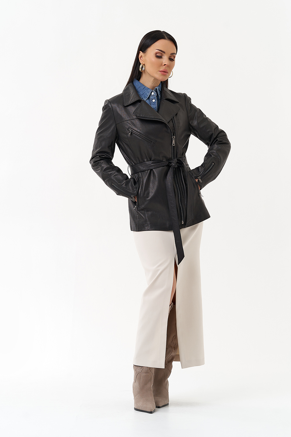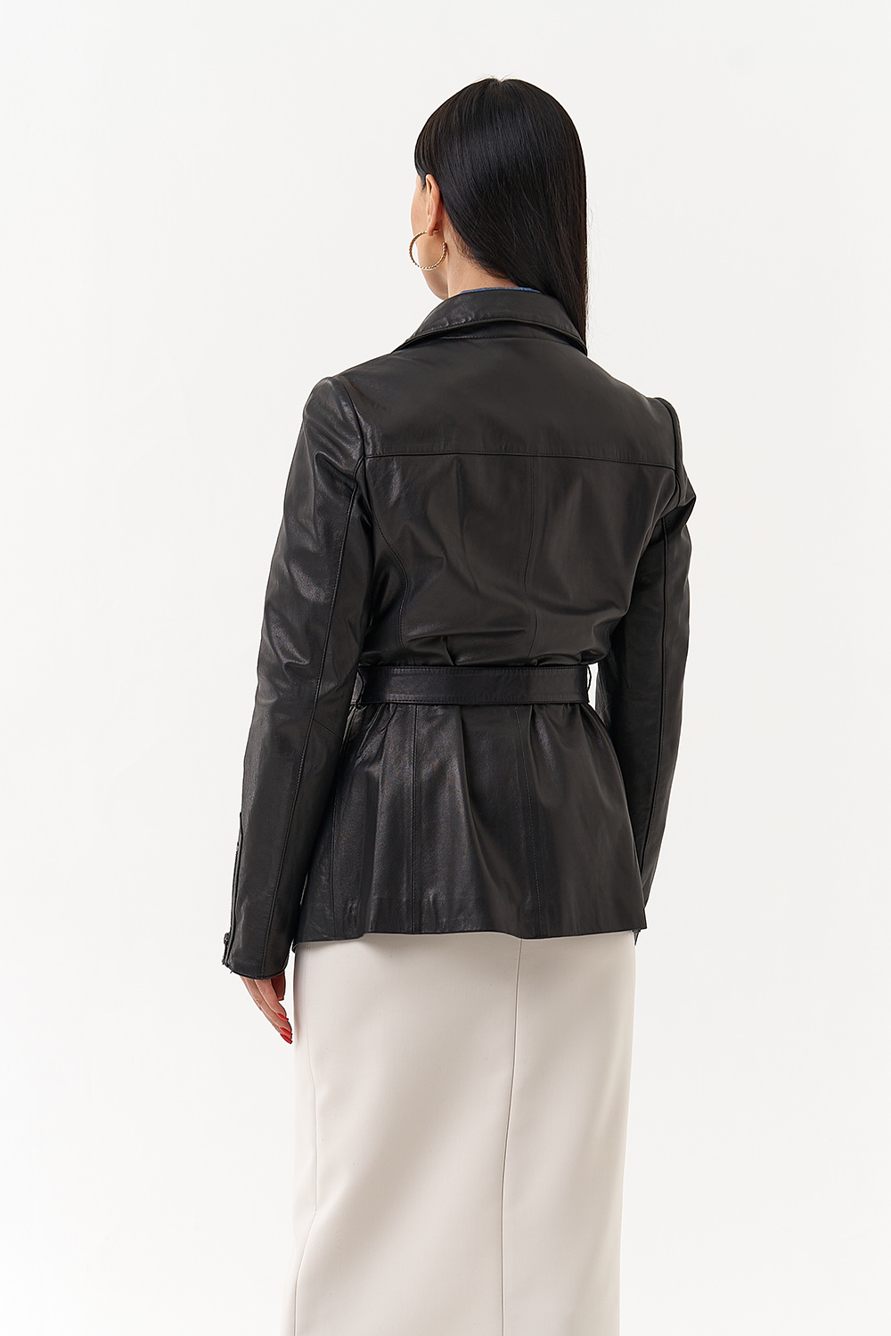 Стильная приталенная куртка из натуральной кожи в классическом черном цвете. Акцентный трансформирующийся английский отложной воротник и стильный пояс делает эту модель незабываемой. Куртка дополнена молнией и удобными карманами. Отлично сочетается с юбками миди и брюками.