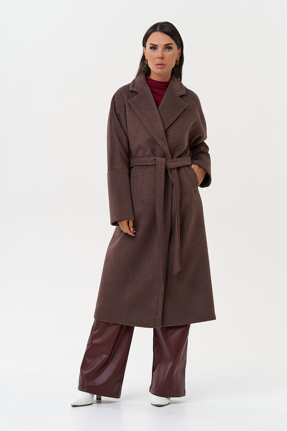 Силуэт - прямой Цвет - коричневый Длина - 115 см Вид полотна - тканое Состав полотна - шерсть 80%, п/э 20% Вид застежки - кнопки Крой воротника - английский воротник Фасон рукава - спущенное плечо, длинный Фасон кармана - прорезной Пояс |
