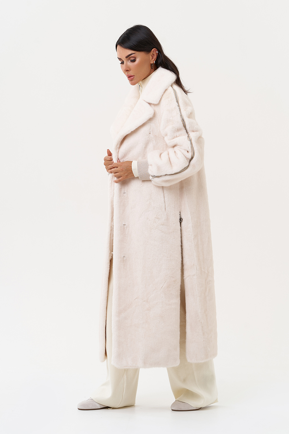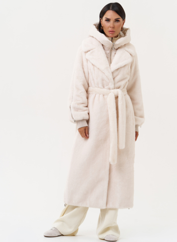Фасон - прямой Длина изделия - 120 см Цвет - светло-бежевый (молочный) Материал - экомех Состав полотна - полиэстер 100% Подкладка - полиэстер 100% Вид застежки - крючки, пояс Вид ворота - съёмный капюшон, английский воротник Фасон рукава - реглан, длинный |