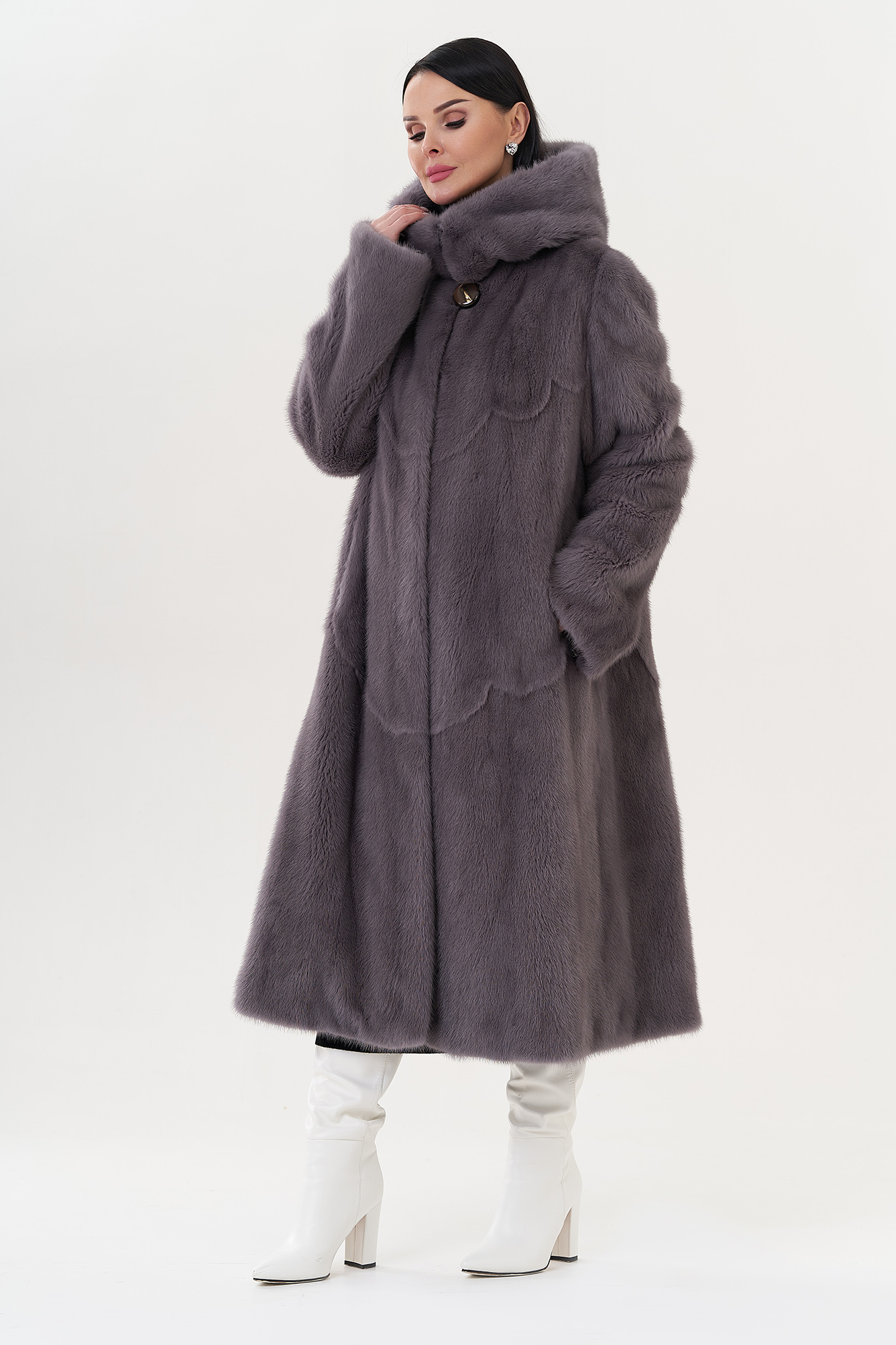 Норковая шуба с капюшоном в фиолетовом цвете.